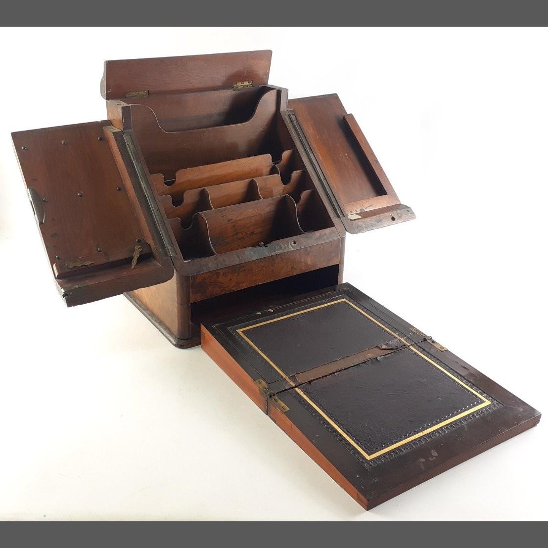 An antique wooden walnut desktop stationery box. Removeable folding slope to bottom. A truly lovely piece. Some minor honest wear. 30cm x 24cm x 35cm approx