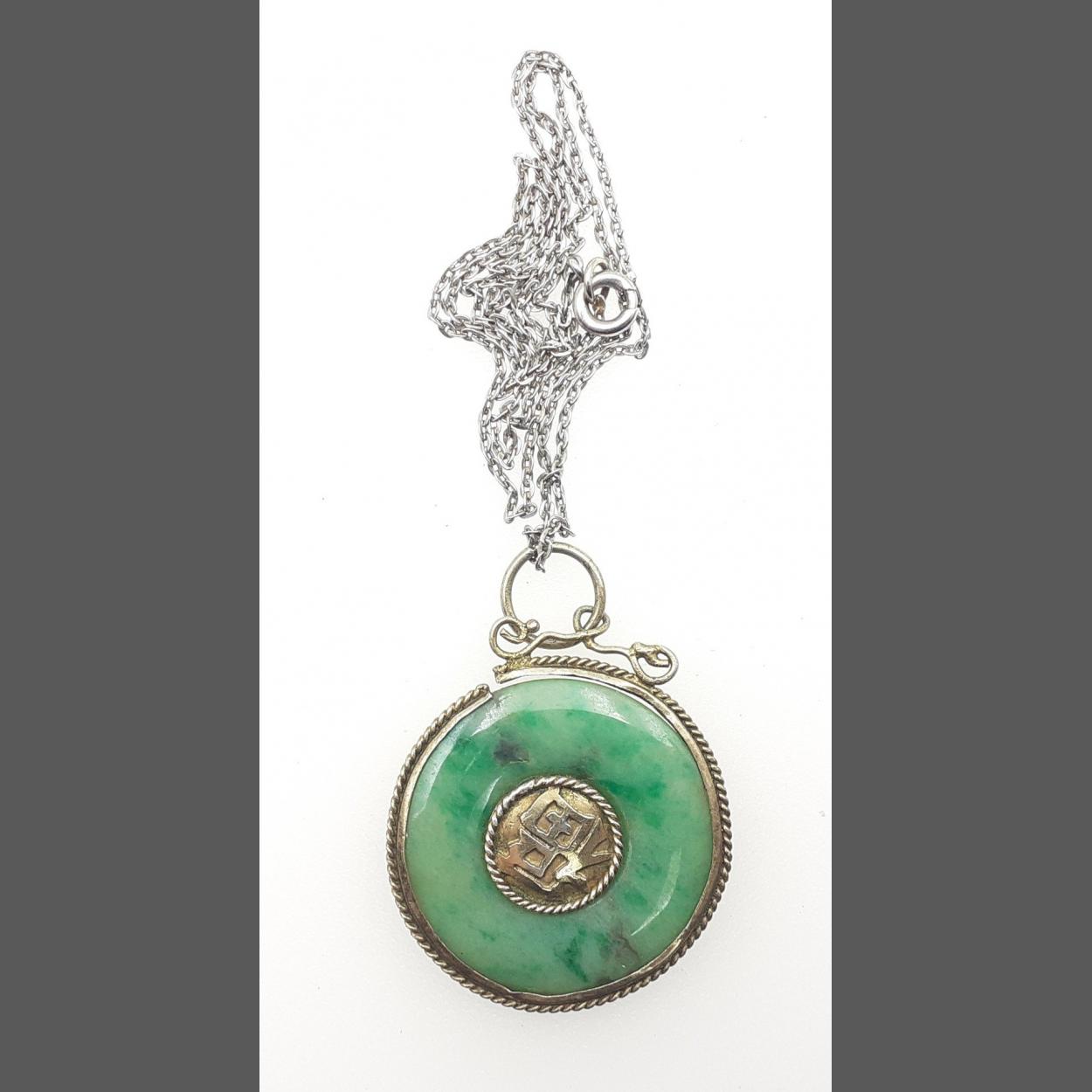 A gorgeous JADE pendant approx 27cm across. Base mount and base metal chain. Break noted to mount.
