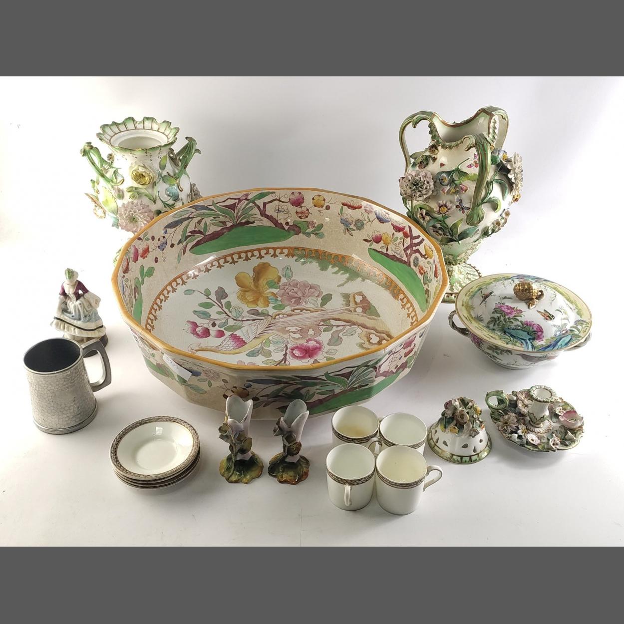 A lovely mixed ceramics to include a very large bowl 41cm in diameter by MASONS A/F (cracked) Also vases and ornaments, pewter tankard etc.