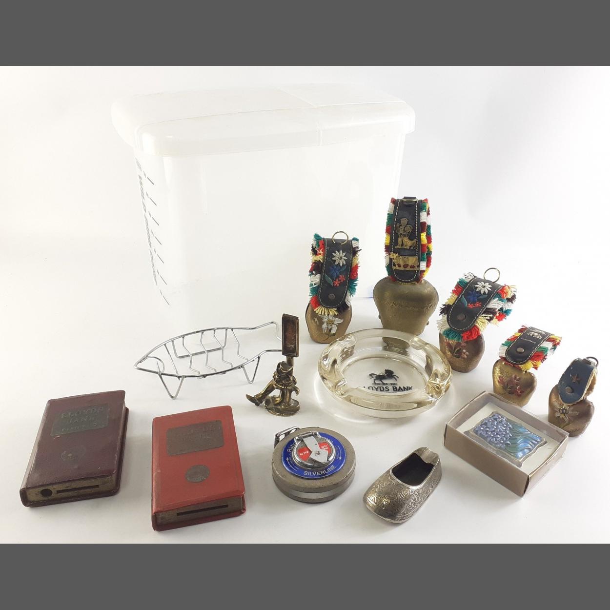 A mixed lot in a good storage tub to include brass bells, trinket box and others.