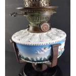 Heavy ANTIQUE cast base ceramic oil lamp. Ceramic in lovely condition with scene of Neptune riding chariot. Ceramic mark for LUIGI TINELLI. Ceramic in undamaged condition. Stands 25cm approx excluding chimney.