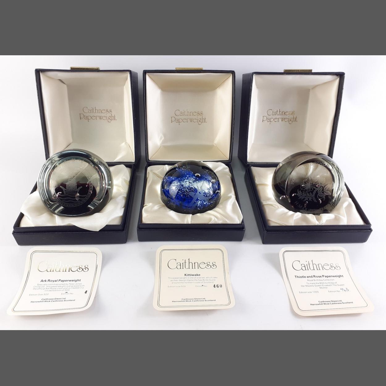 Three CAITHNESS GLASS paperweights in presentation gift boxes. One Thistle and Rose for Queens 80th Birthday, ARK ROYAL and limited edition (460/500) KITTIWAKE. All in lovely well stored condition.