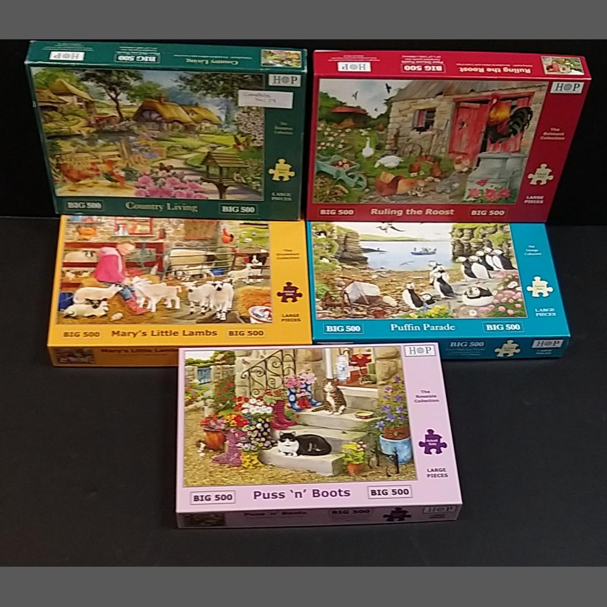 Get ready for the long winter nights. JIGSAWS 500 piece x 5. Mary's Little Lamb, Puss in Boots, Ruling the Roost, Puffin Parade and Country Living. All jigsaws have been checked and are complete and in good condition.