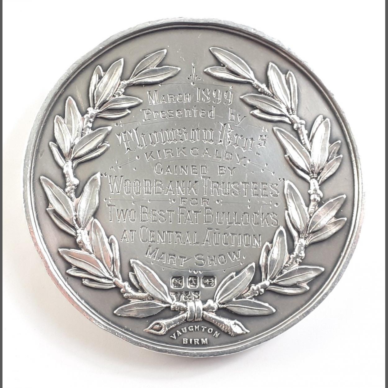 SOLID SILVER Scottish Agricultural Medal. Fife Interest. Won by WOODBANK TRUSTEES for Two Best Fat Bullock Mart Show 1899. 5cm. Weight 54g approx. Lovely piece in great condition.