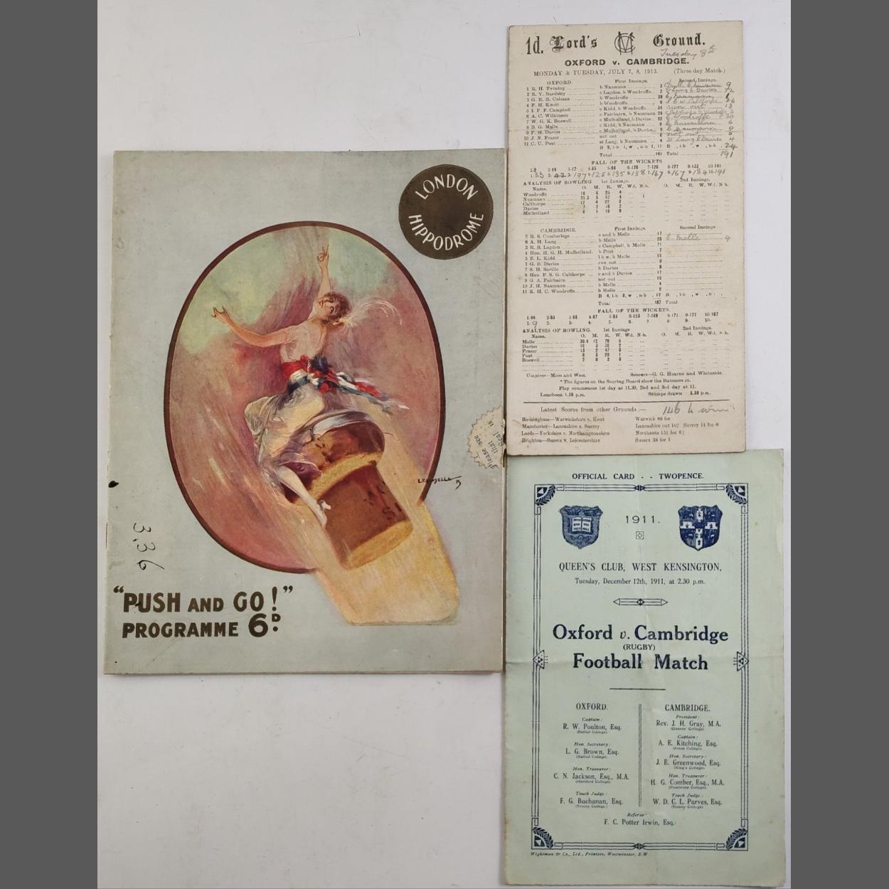 Rare ephemeral survivors to include 1911 OXFORD v. CAMBRIDGE (rugby) FOOTBALL MATCH programme, a 1913 OXFORD v CAMBRIDGE cricket programme played at Lord's with scores entered in pencil. Plus also a similarly aged programme from the LONDON HIPPODROME show ' Push and Go!