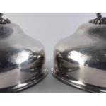Two matching silver plated platter covers with inscribed family crest GANG WARILY. Each 36cm approx. Both in good condition.