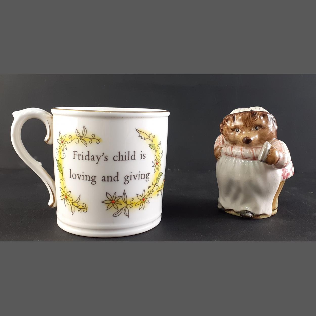 A ROYAL DOULTON hand-painted mug with 'Friday's child is loving and giving' and also a BESWICK Mrs Tiggywinkle (approx 9cm tall)