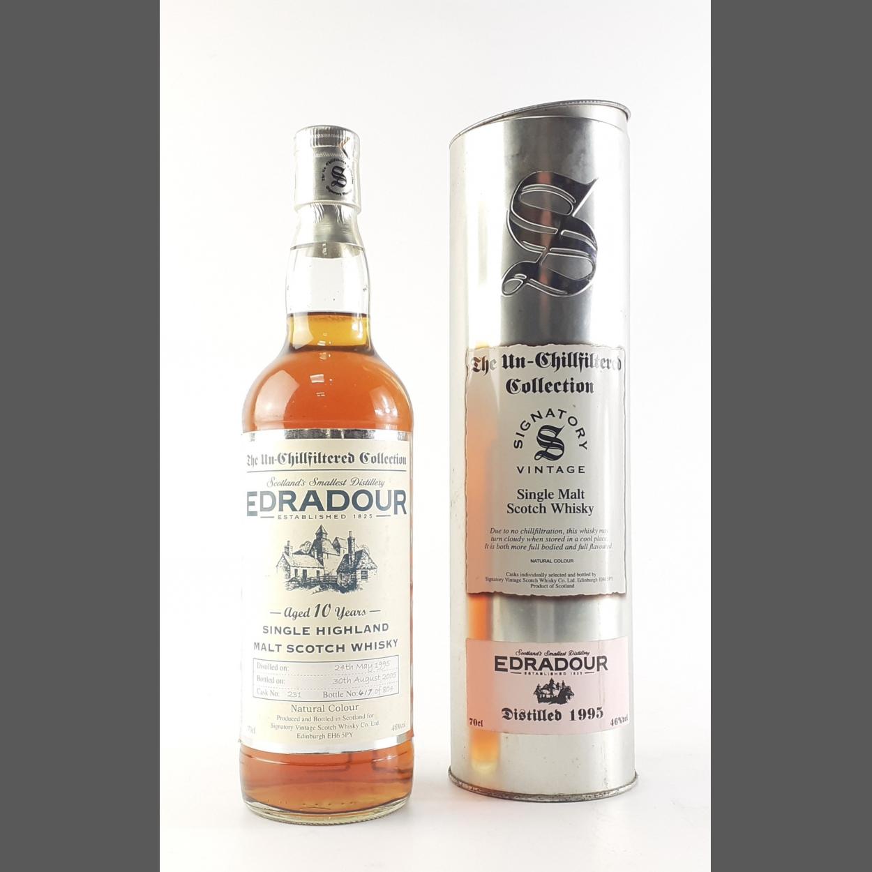 A 70cl bottle of EDRADOUR 10 year single Highland malt Scotch whisky, distilled 1995, bottled 2005. Bottle 417 of 804. In original tin