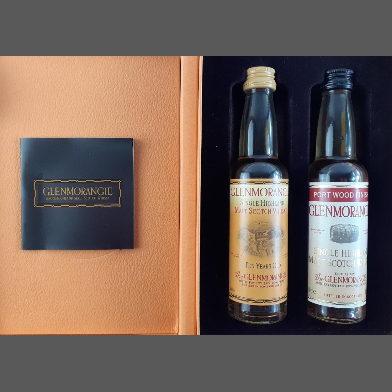 A presentation box with 2 x 10cl bottles of GLENMORANGIE 10 years old and GLENMORANGIE port wood finish. Box slightly damaged