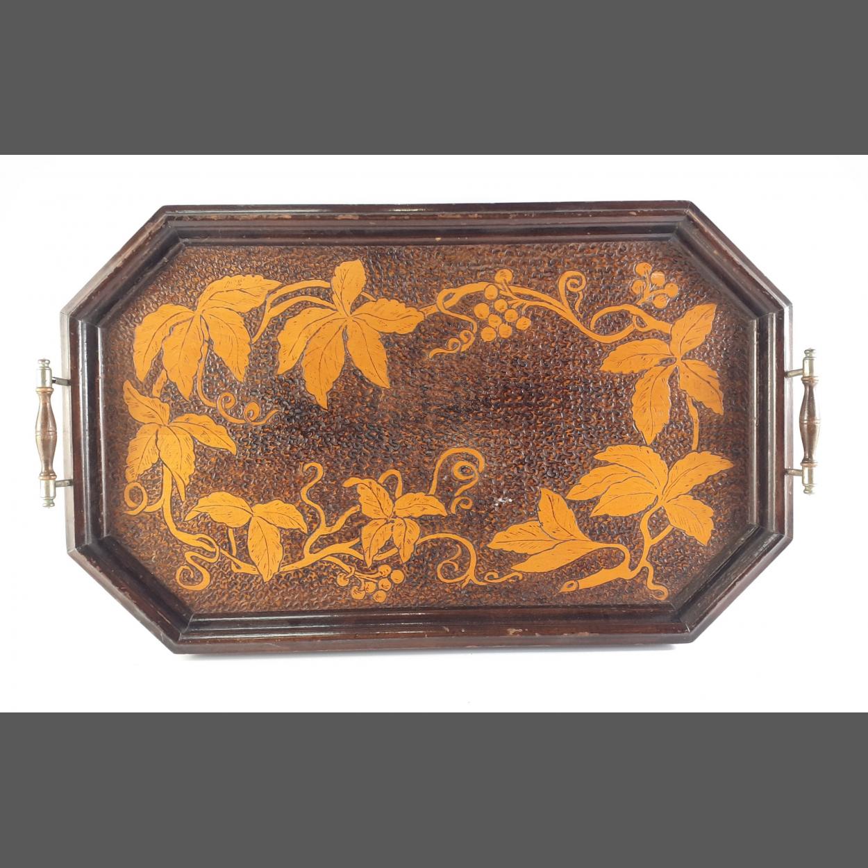 An antique wooden tray with inlaid vine design. Measures 60 x 35cm approx