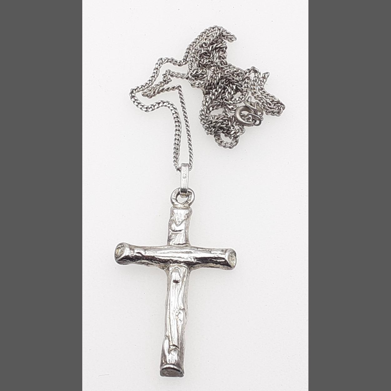 An 800 stamped crucifix on 925 stamped chain. Note chain is broken. Chain is 47cm long. Gross weight: 9g approx