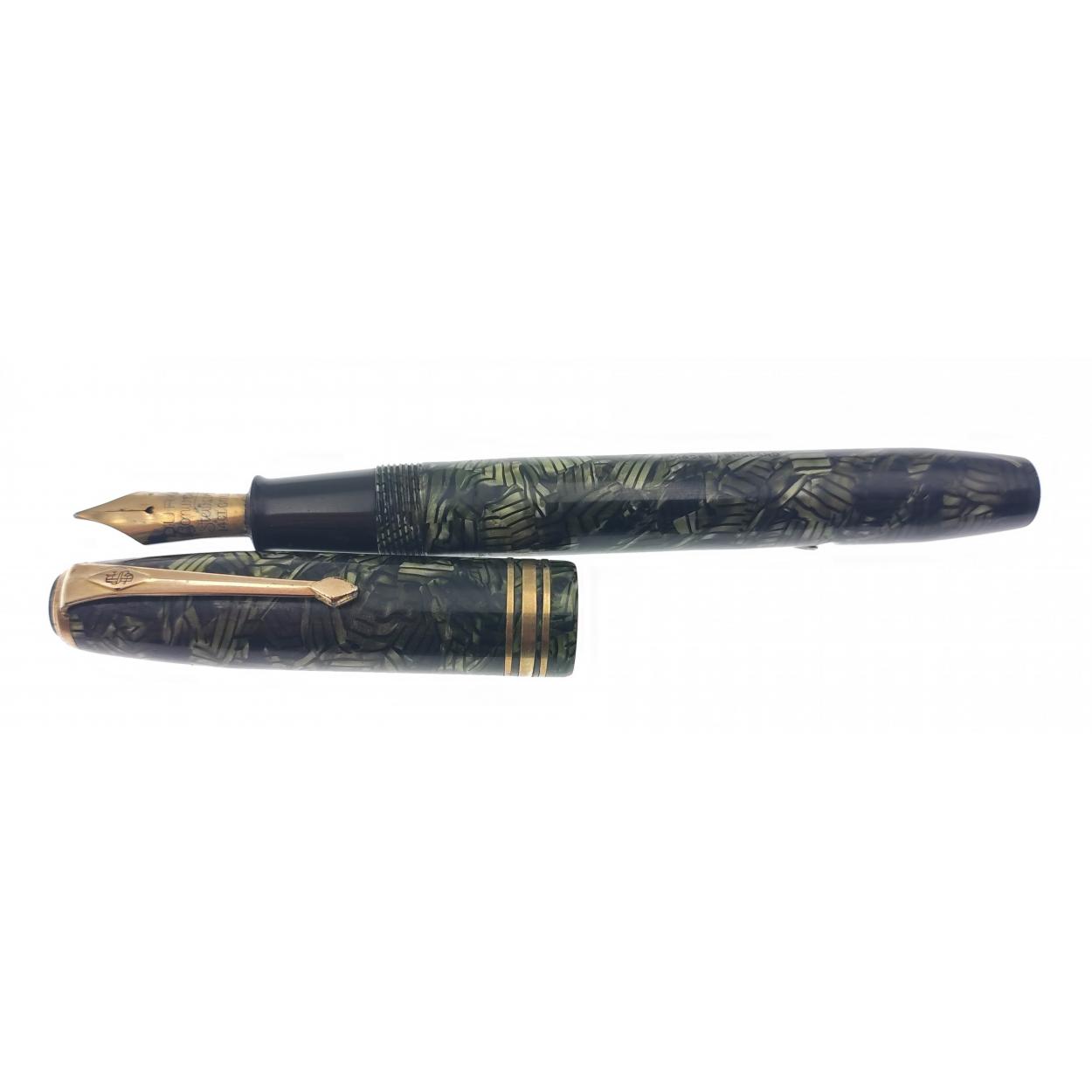A CONWAY STEWART 58 green fountain pen with 14K nib. Attractive mottled green colour with no cracks, splits or damage to hardware. Refill lever stiff.