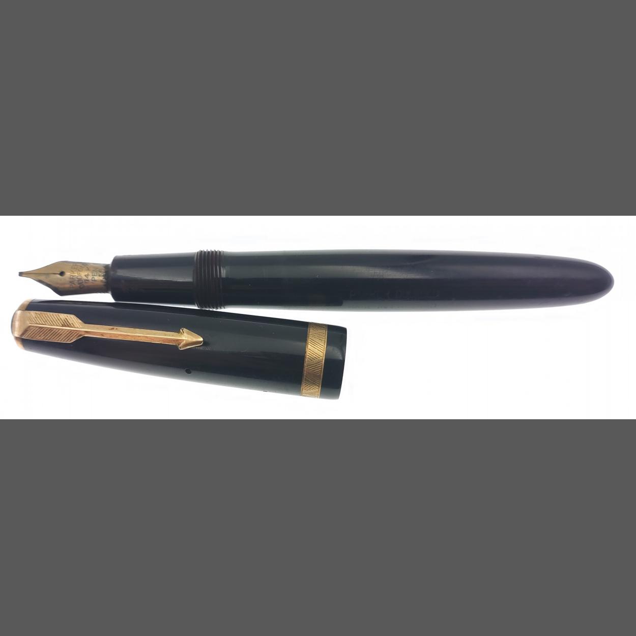 A PARKER DUOFOLD fountain pen with 14K nib. Black with gilt fittings. No cracks, splits or damage to hardware.