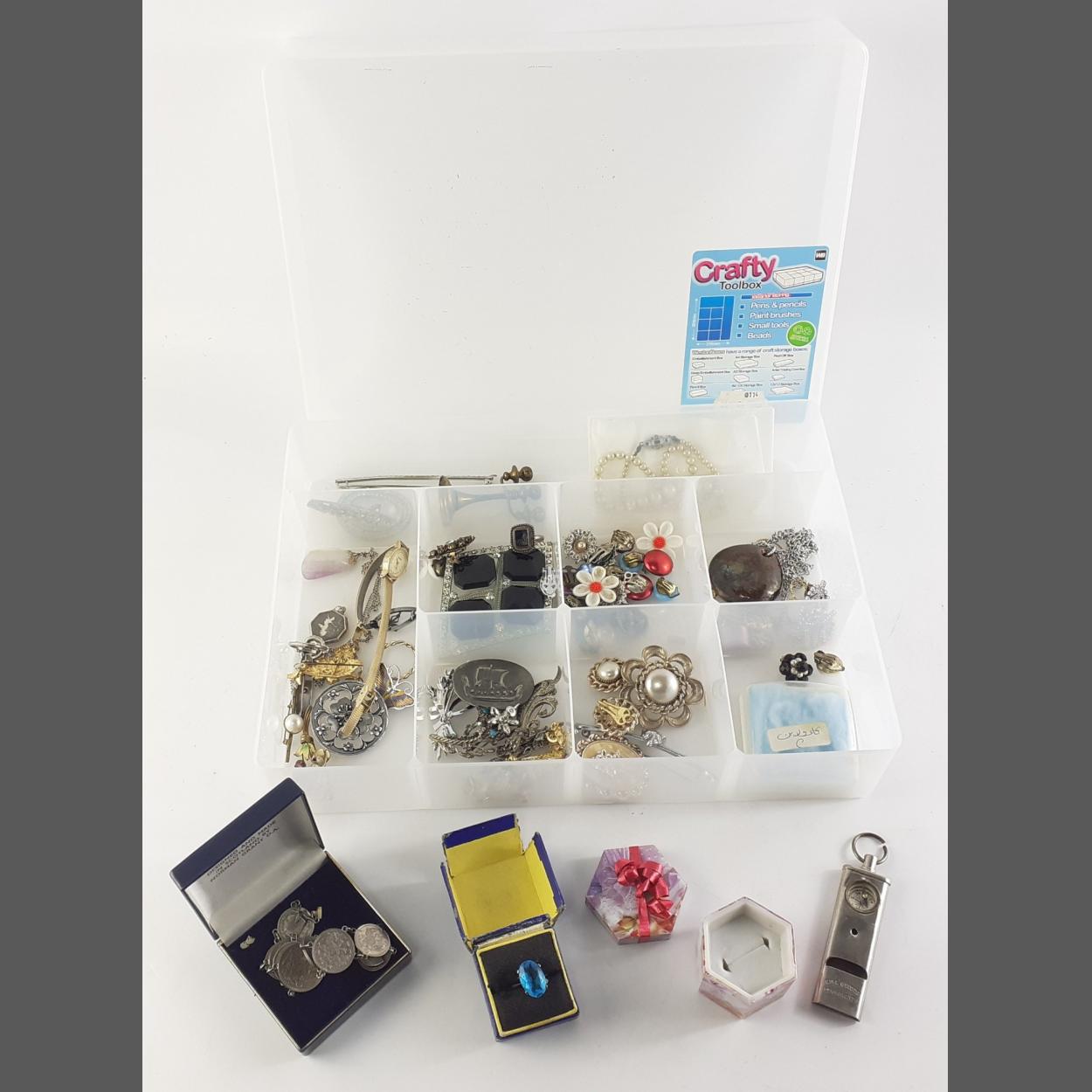 A plastic jewellery tub with mixed costume jewellery including a 'kopek' bracelet, a SEKONDA cocktail watch, whistle with incorporated compass and much else.