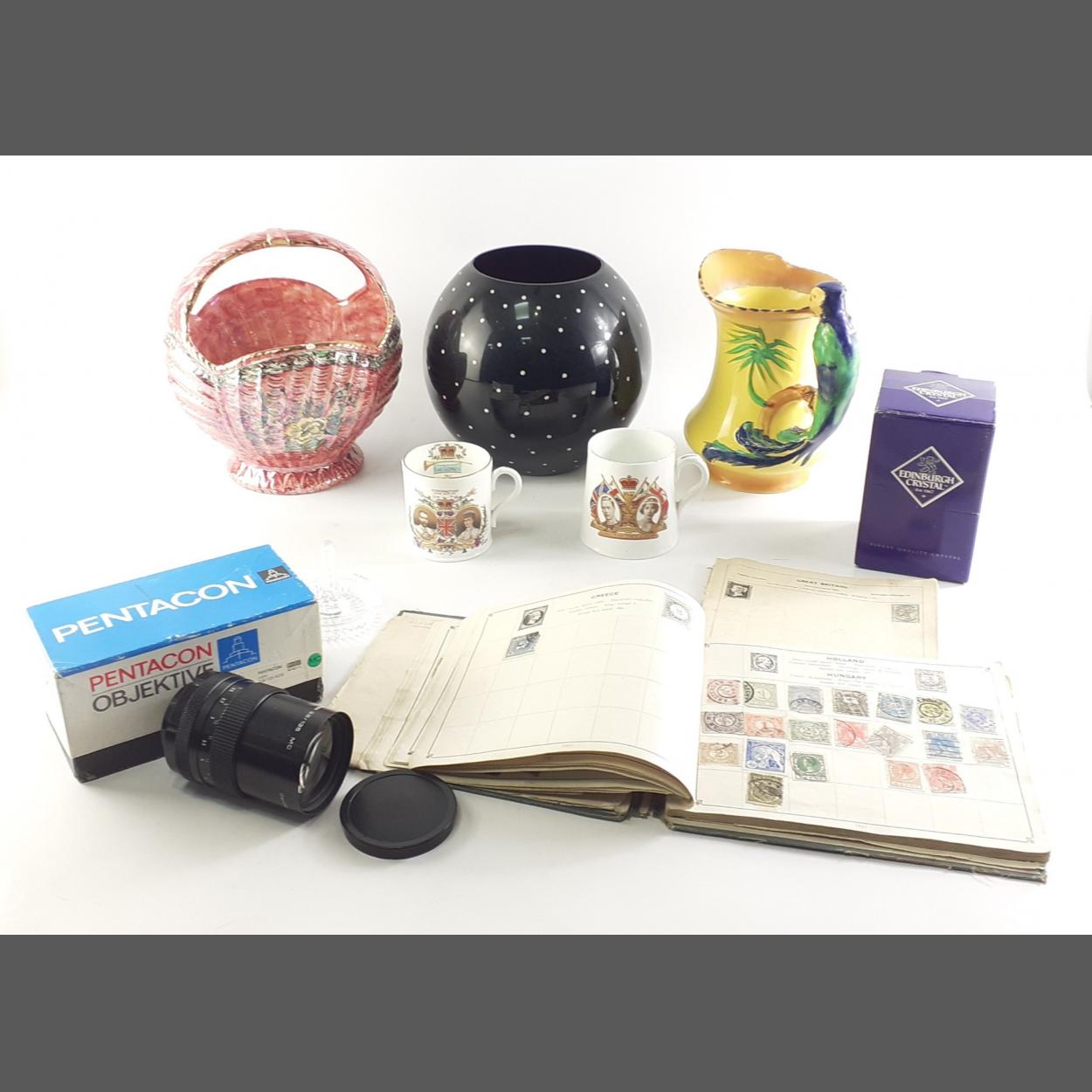 A mixed box to include boxed and labelled EDINBURGH CRYSTAL ring dish, 2 vases, 1 colourful BURLEIGH ware jug (19cm approx), commemorative mugs, stamp album