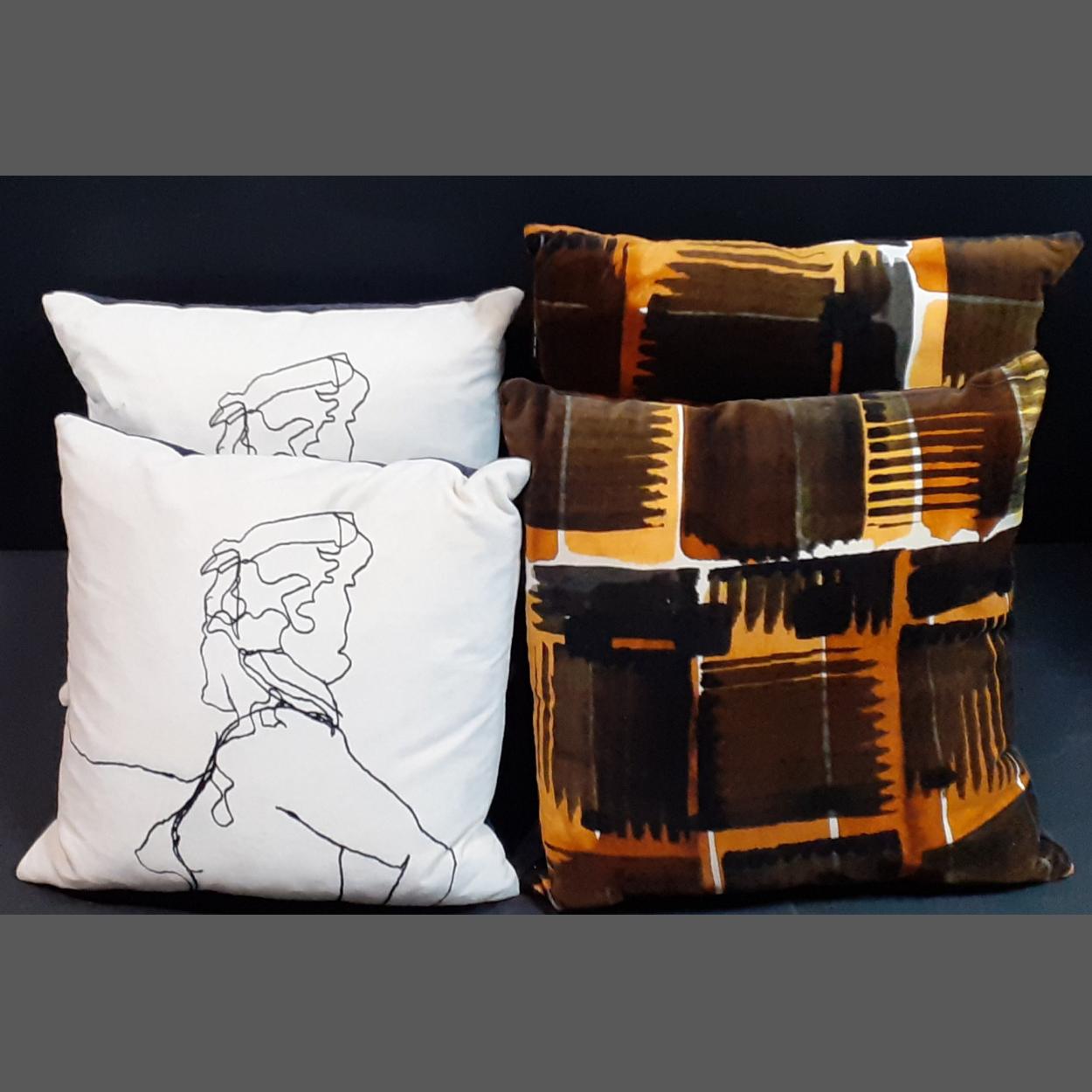 Four ONE NINE EIGHT FIVE cushions, 2 ERWIN ABSTRACT check velvet 36 x 36cm approx. The other 2 WOMAN LINE DRAWING white velvet 35 x 35cm approx