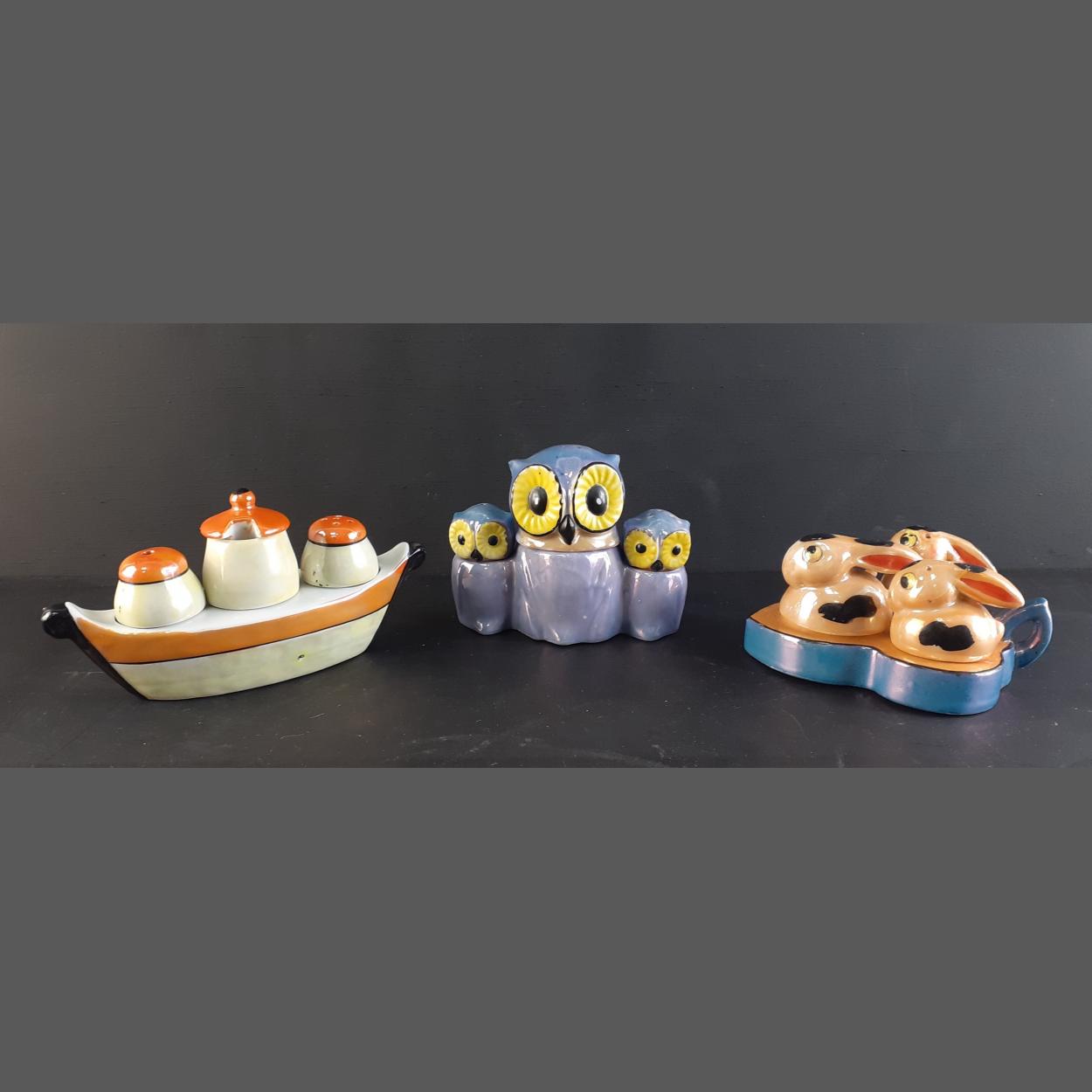 Three novelty Czechoslovakian lustre condiment sets comprising rabbits, owls, and a ship. All in nice clean undamaged condition.