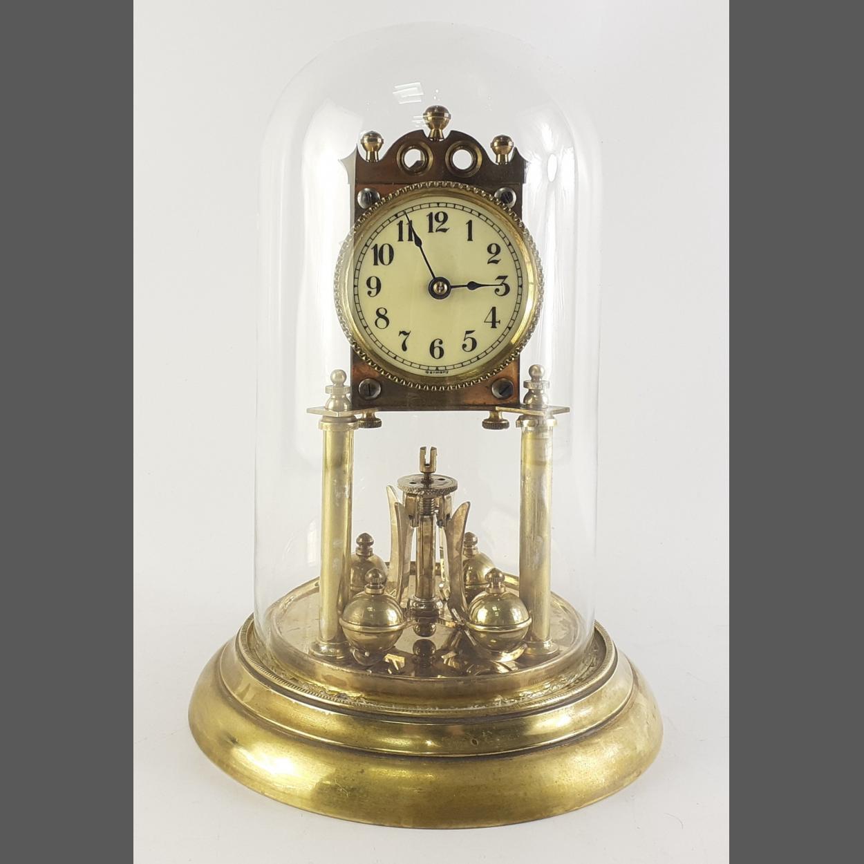 A glass domed German brass clock. A/F. In a state of disrepair but displays well. Dome has nibbles to base. Stands 28cm approx.