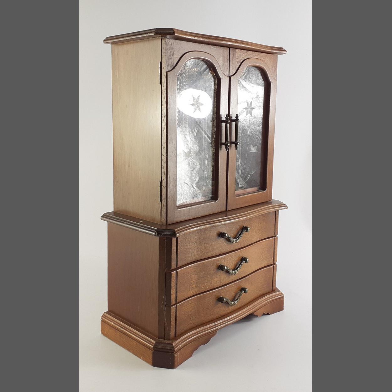 A dresser style jewellery case 44 x 28 x13cm approx. Contents include necklaces, 2 drawers of beaded necklaces etc
