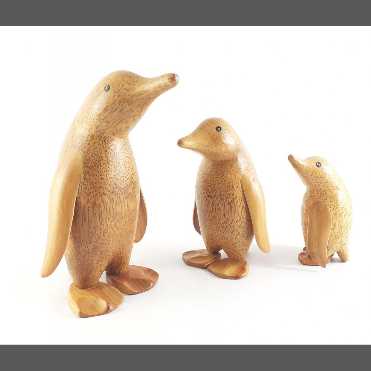 A family of three wooden DCUK PENGUINS the tallest 23cm approx. All in good condition.