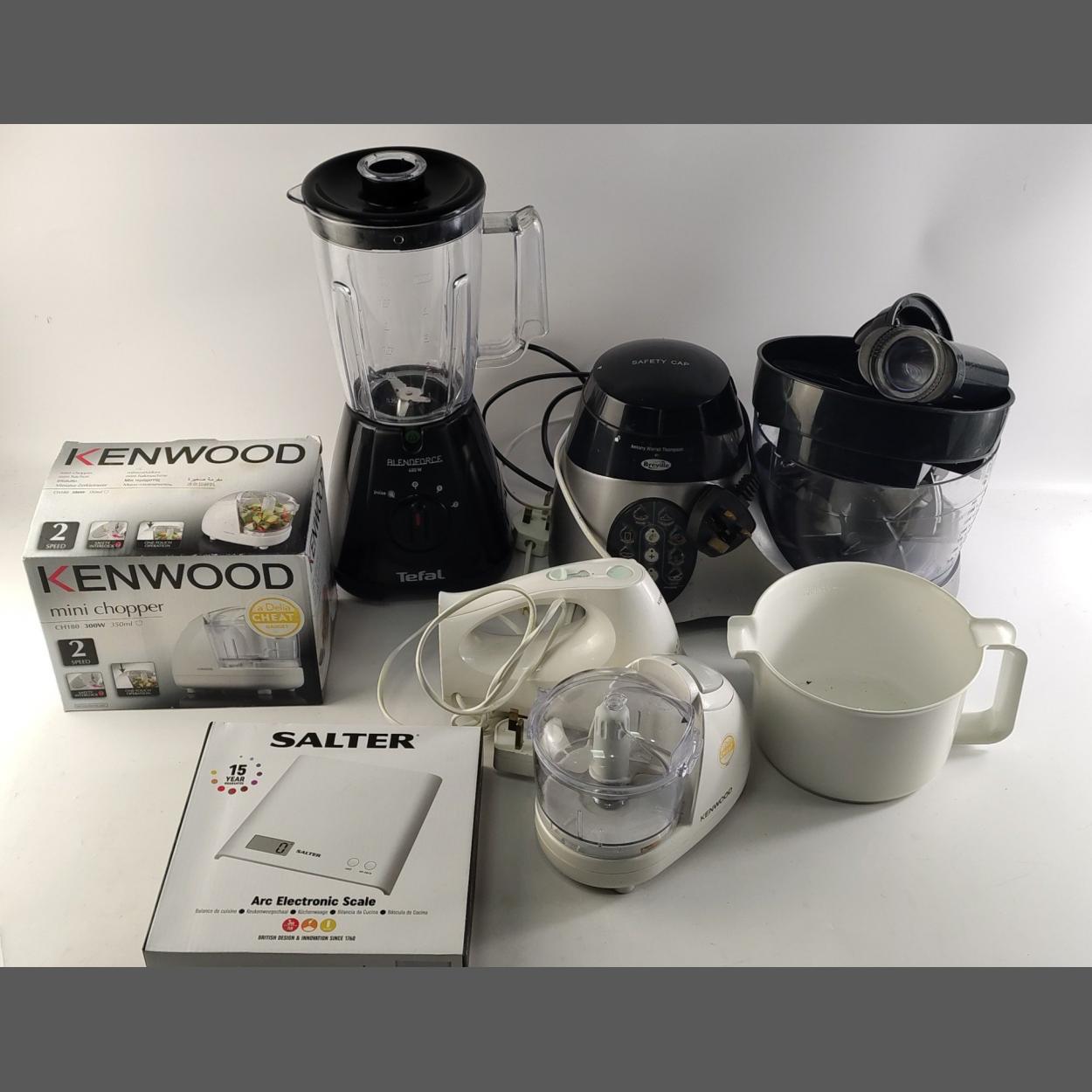 Mixed lot of good quality kitchen appliances to include TEFAL blender, mini chopper, Salter scales, and other parts and accessories.