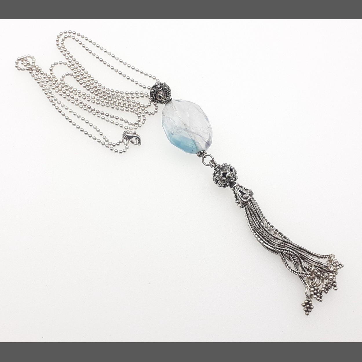 EYE-CATCHING - A 925 stamped chain with large pale blue stone and Asian style drop pendant. A very pretty substantial piece. 80cm chain, the whole weighing 35.9g approx.