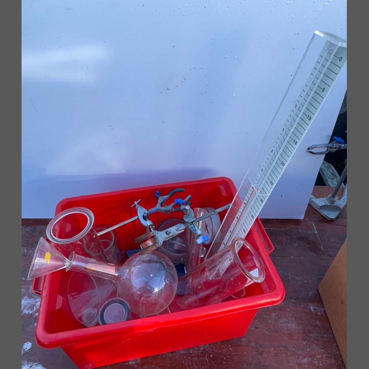 Peebles High School fund raising - Science dept mixed box of laboratory glassware to include two test tube clamp stands, funnels, PYREX ERLENMEYER flask ranging 500ml - a glass mortar and pestle and a BOYLES LAW apparatus etc