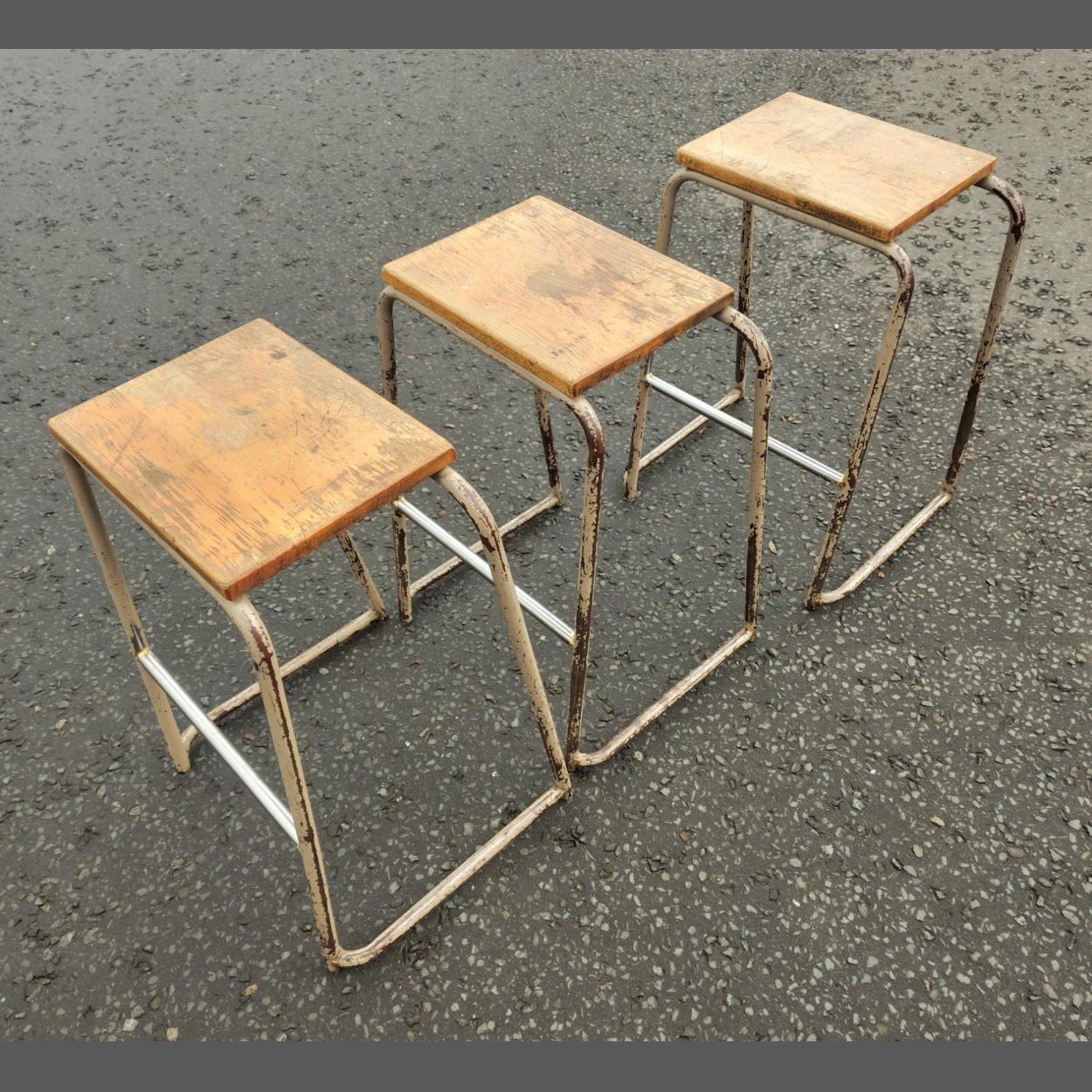 Peebles High School fund raising - VINTAGE RETRO c70's reclaimed ex-school stacking stools x 3 quantity - height 61cm x depth 25cm x width 44cm approx