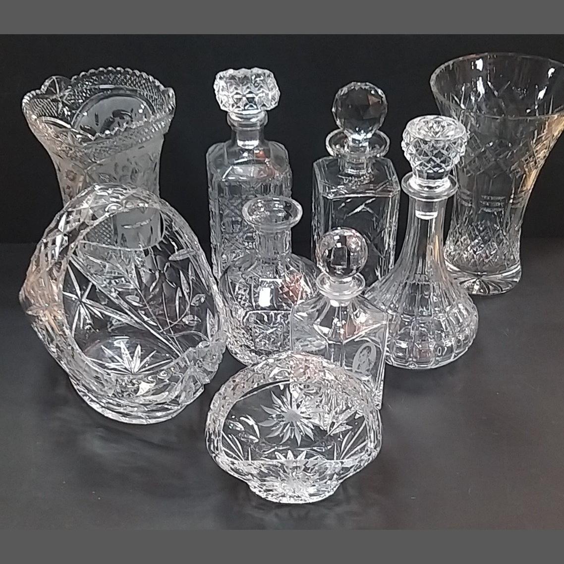 A collection of glassware to include 4 vases and 6 decanters (2 without stoppers)