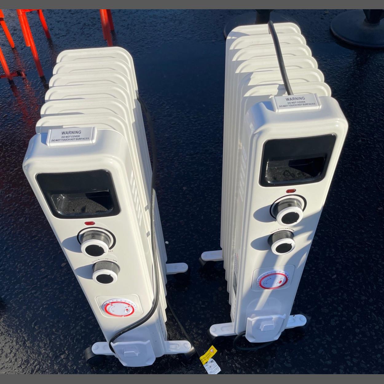 Peebles High School fund raising - Both KINGFISHER make of oil filled style electric radiators x 2 qty - both on castors - both 64cm height x 15cm width x 30cm long approx