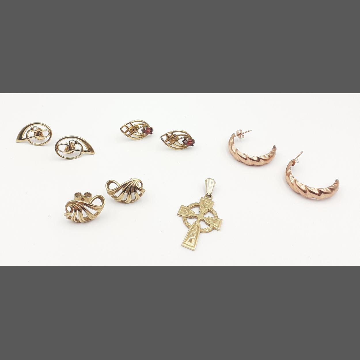 A collection of hallmarked and 9ct stamped earrings and a Celtic pendant. Gross weight 7.7g approx