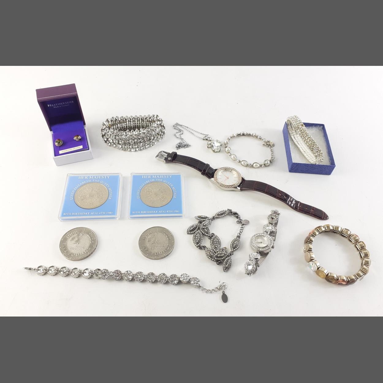 A mixed jewellery lot to include a super faux diamond bracelet, an elasticated faux stone bracelet, a Marcasite bracelet, two watches, a Heathergems pair of earrings and others including two £5 coins