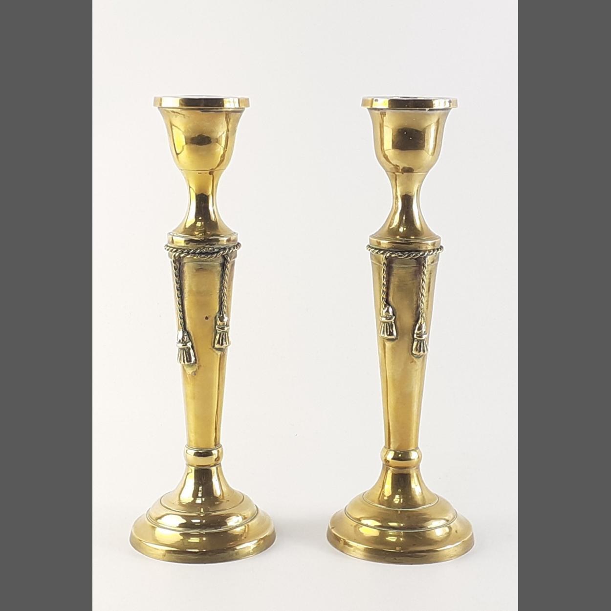 A pair of very attractive brass candlesticks with tassel rope adornments. Each stands 25cm high. In good condition.