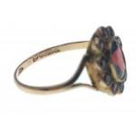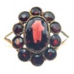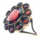 A fully hallmarked 9ct ring with a central 6mm red stone surrounded by 10 smaller. Nice stones. Ring size L, gross weight 1.25g approx. Presented in older Redditch Jeweller's box.