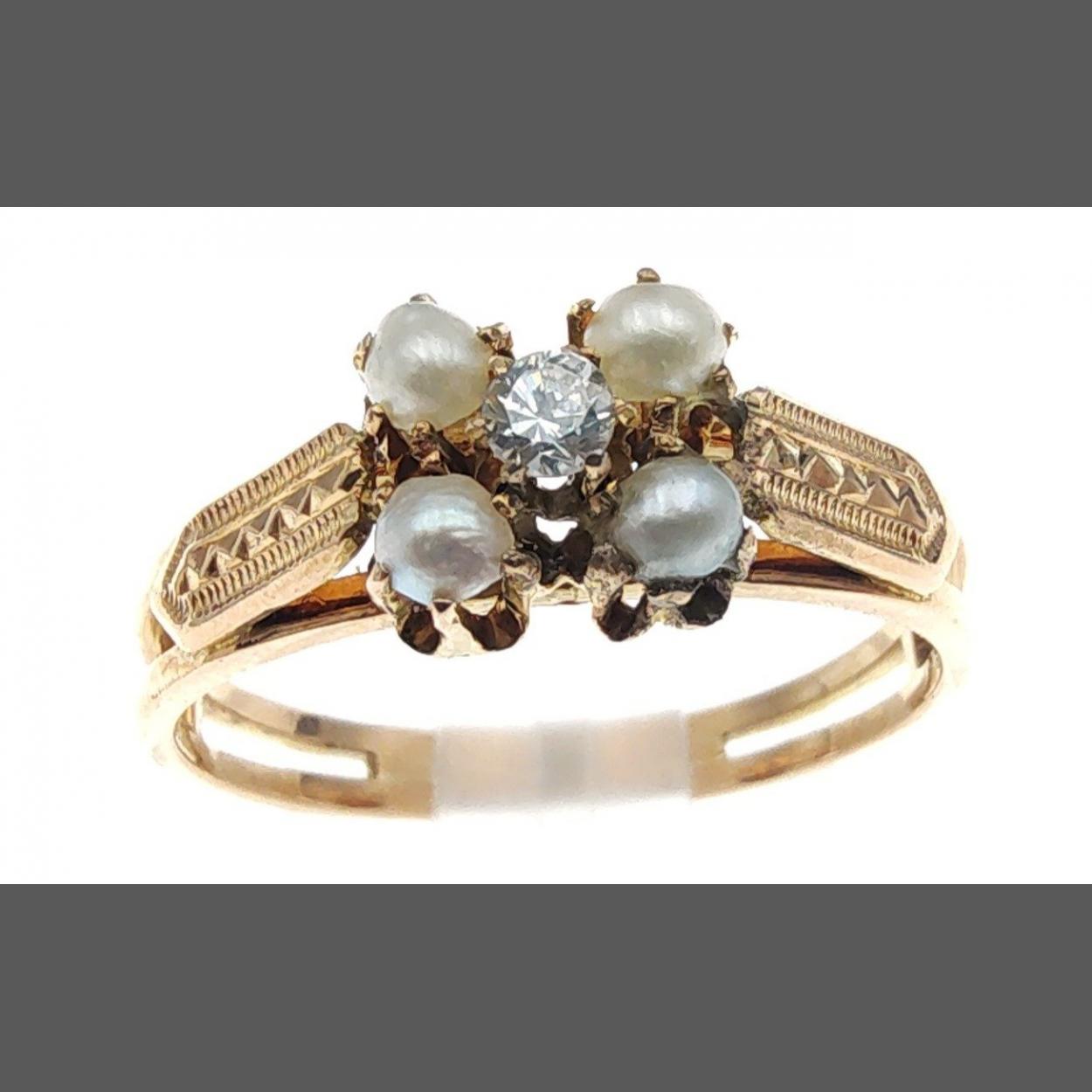An unmarked yellow metal ring with central clear stone with four seed pearls. Size N, gross weight 2.15g approx