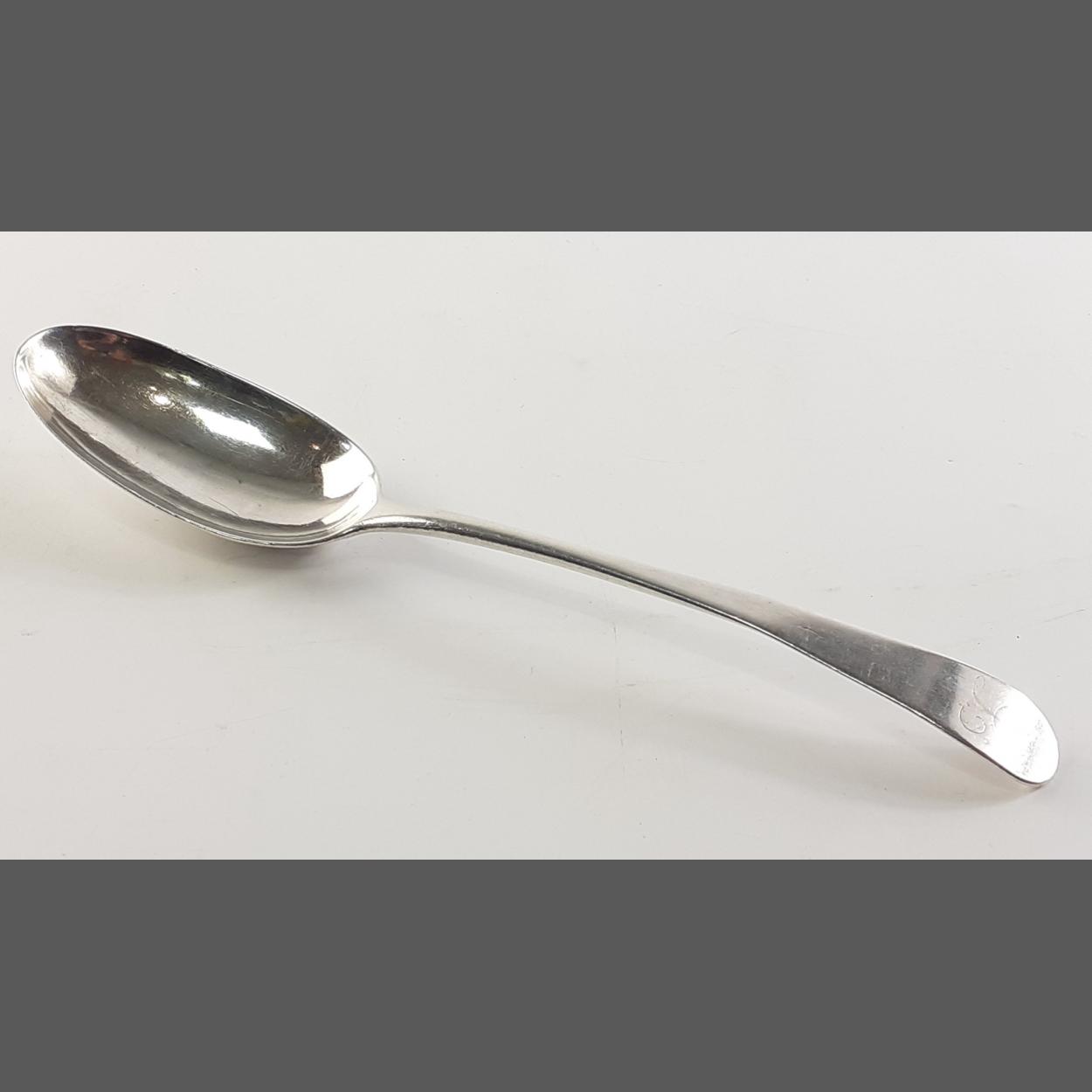 A white metal spoon believed JAMES GORDON stamped (JG) antique spoon with rubbed monogram. 21cm approx. Gross weight 54g approx.