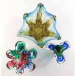 SUPER COOL VINTAGE GLASS - Three super multi coloured MURANO style glass vases. The largest 25cm across. All in good undamaged condition.