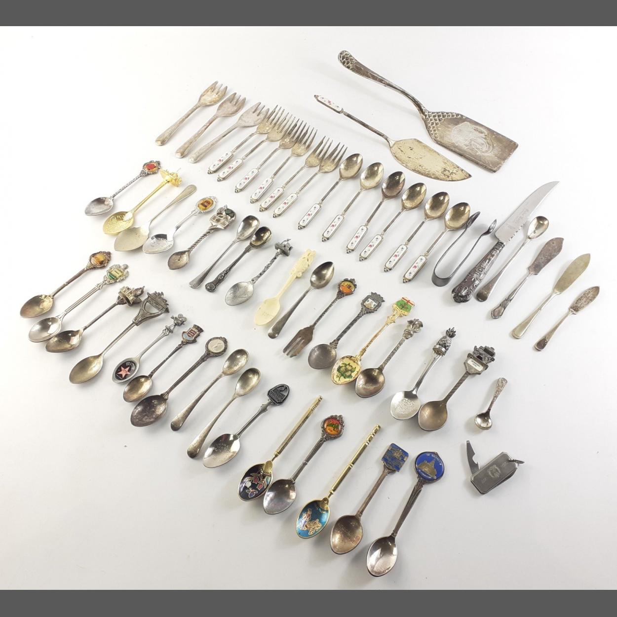 A good handy lot which includes many souvenir teaspoons, a Corontation fob pocket knife and one silver handled knife.