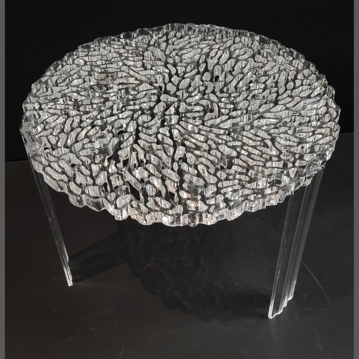 DESIGNER PATRICIA URQUIOLA T-Table Basso Kartell in transparent Perspex reminiscent of embroidery - dimensions 36cm height x 50cm diameter - cost new £240 approx
