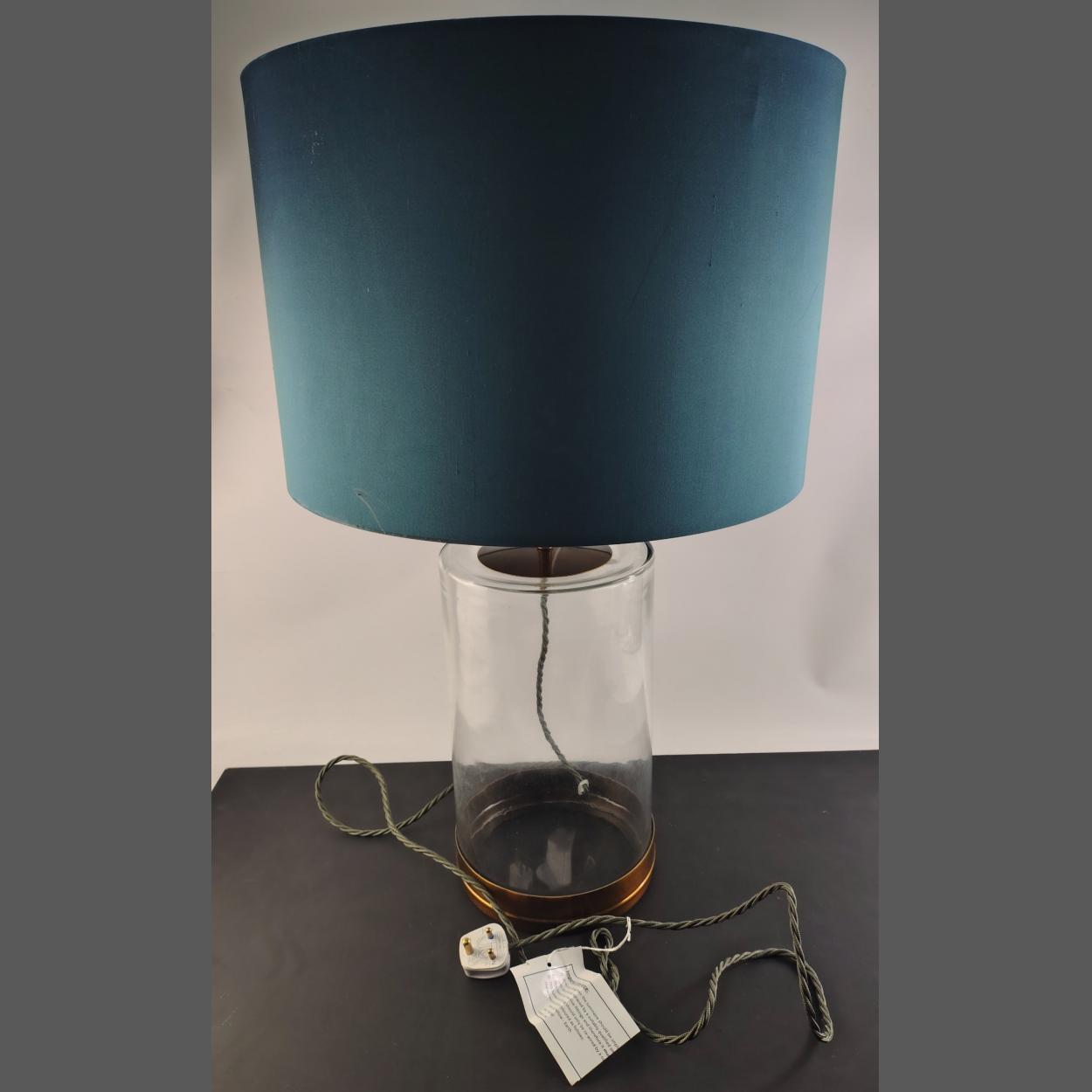 A modern adjustable table lamp with super large teal fabric shade (45cm approx) and glass base. Base height 36cm approx. Total height 74cm approx.