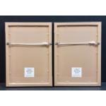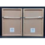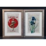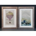 Four rather attractive coloured prints on old German text comprising a hot air balloon, the Tin Man from Wizard of Oz, blue irises and the Great Wave of Kanagawa. Matching frames measure 33 x 24cm approx