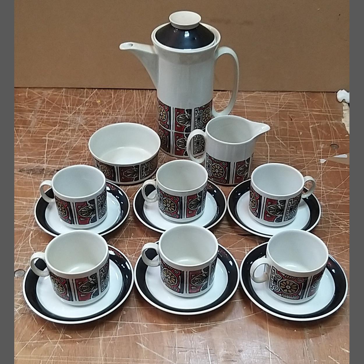 BURLEIGHWARE BURSLEM RETRO Amazon pattern coffee service with 6 cups, six saucers, and an elegant lidded coffee pot with cream and sugar - no signs of damage repair