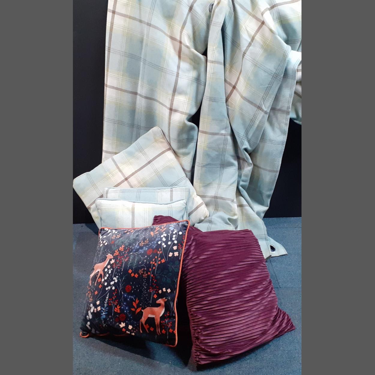 A good Home Fabric lot to include curtains with a 220cm drop and each 180cm wide. With two matching cushions and four others.
