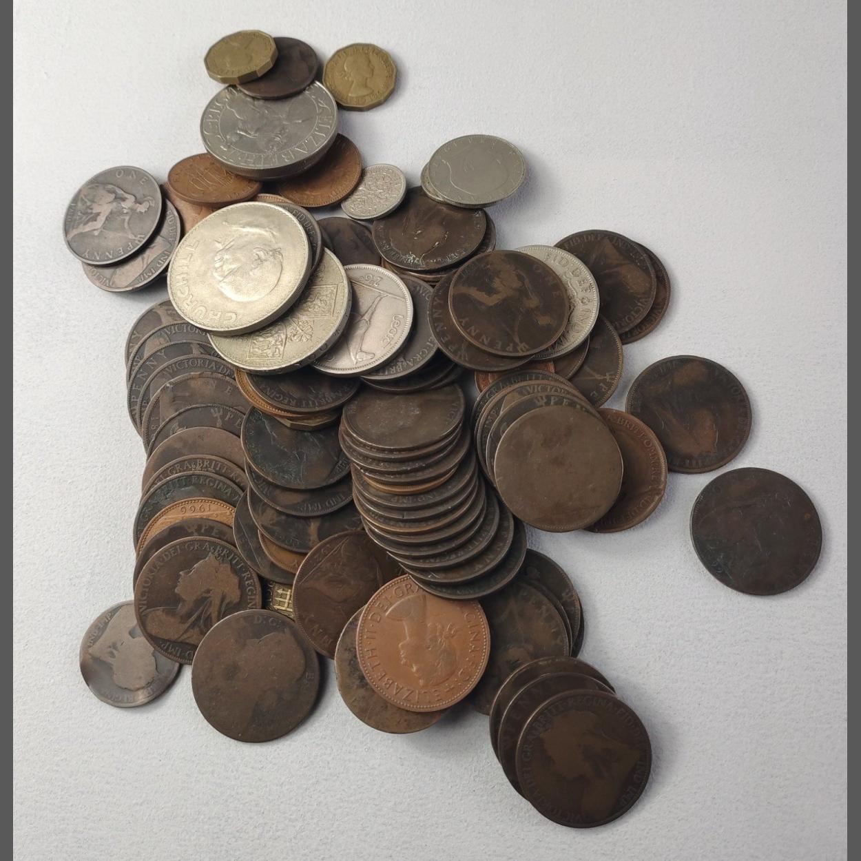 A mixed lot of obsolete UK coinage and some Crowns. Includes many pennies,thruppeny pieces and others.