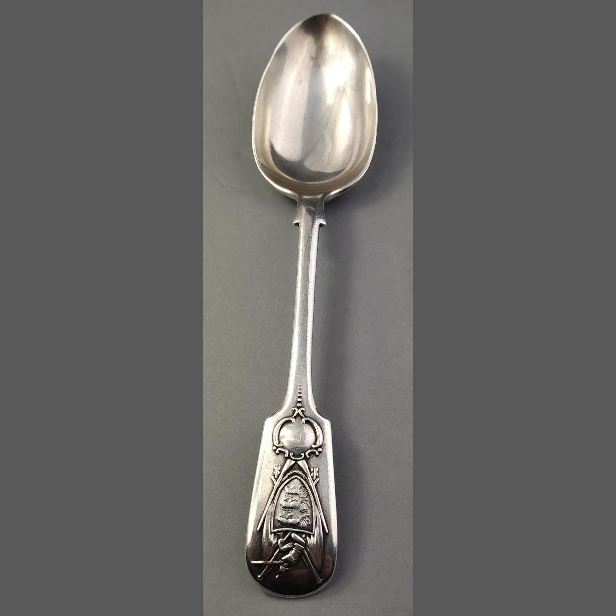 A STERLING SILVER fully hallmarked spoon with Sheffield possibly 1905 marks. The finial with scarce crest showing three lions on shield and sharp shooter above with draped flags. Length approx 21cm, weight 94g approx. A beautiful piece in collectible condition by Joseph Rodgers & Sons 1913