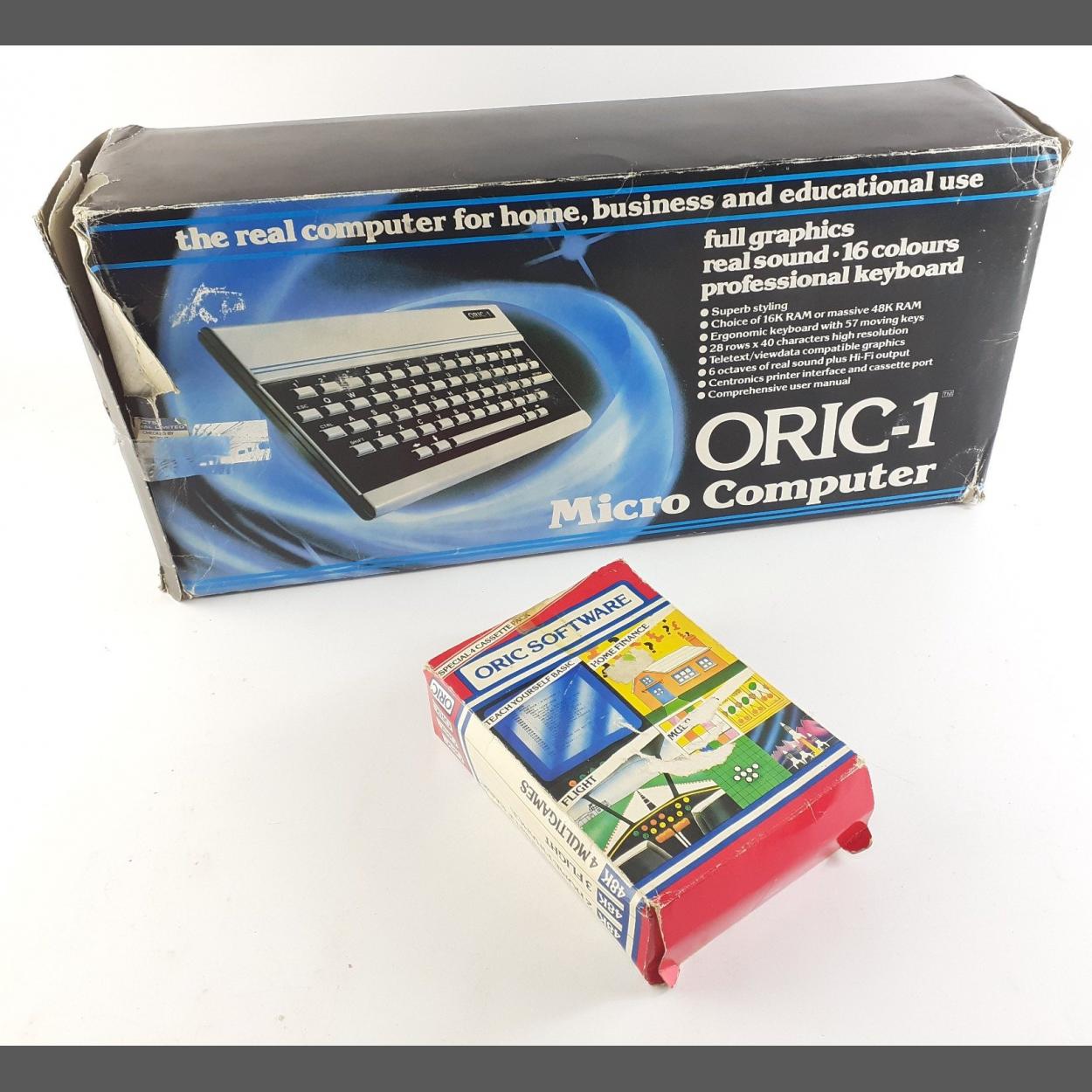 A boxed ORIC -1 micro computer along with a special 4 cassette pack of games including Teach Yourself Basic, Home Finance, Flight and Multi Games. Untested.