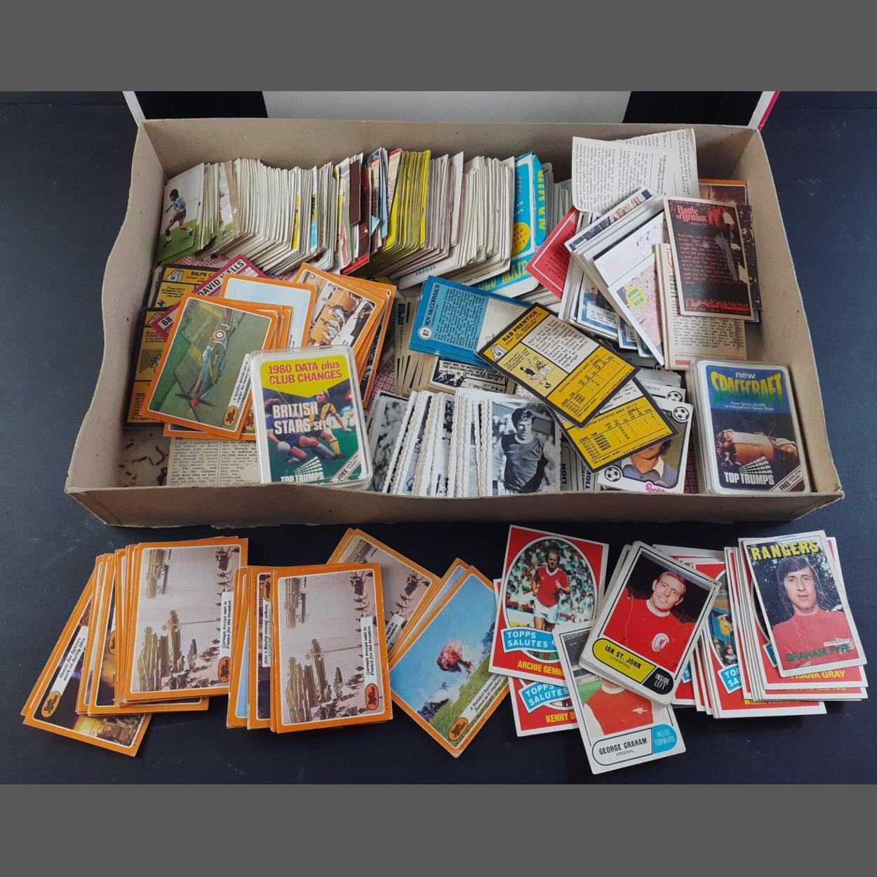 A box of cards to include some odds from TOPPS, A&BC etc. English and Scottish footballers, Top Trumps, Daily Mirror