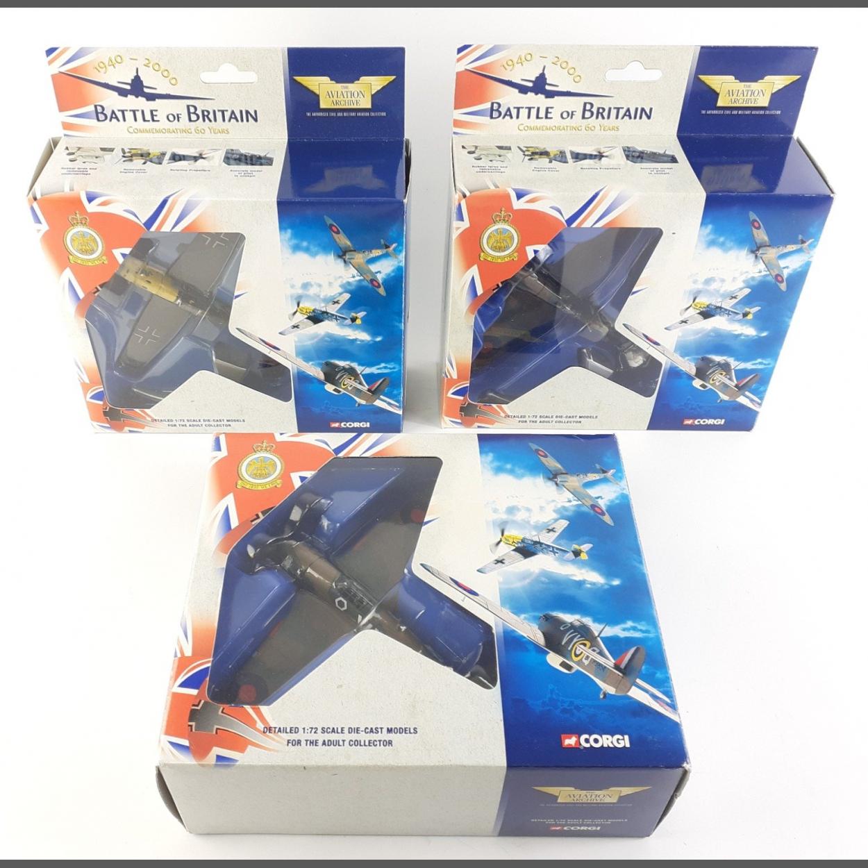 Tree CORGI BATTLE OF BRITAIN models - 49201 Messerschmitt 109E JG-3 'Udet', 49001 Spitfire MK1 74 Sqd RAF (First Skirmish of Battle of Britain) and 49101 Hawker Hurricane MK1 85 Sqd RA. Scale 1:72. All boxed in excellent condition.