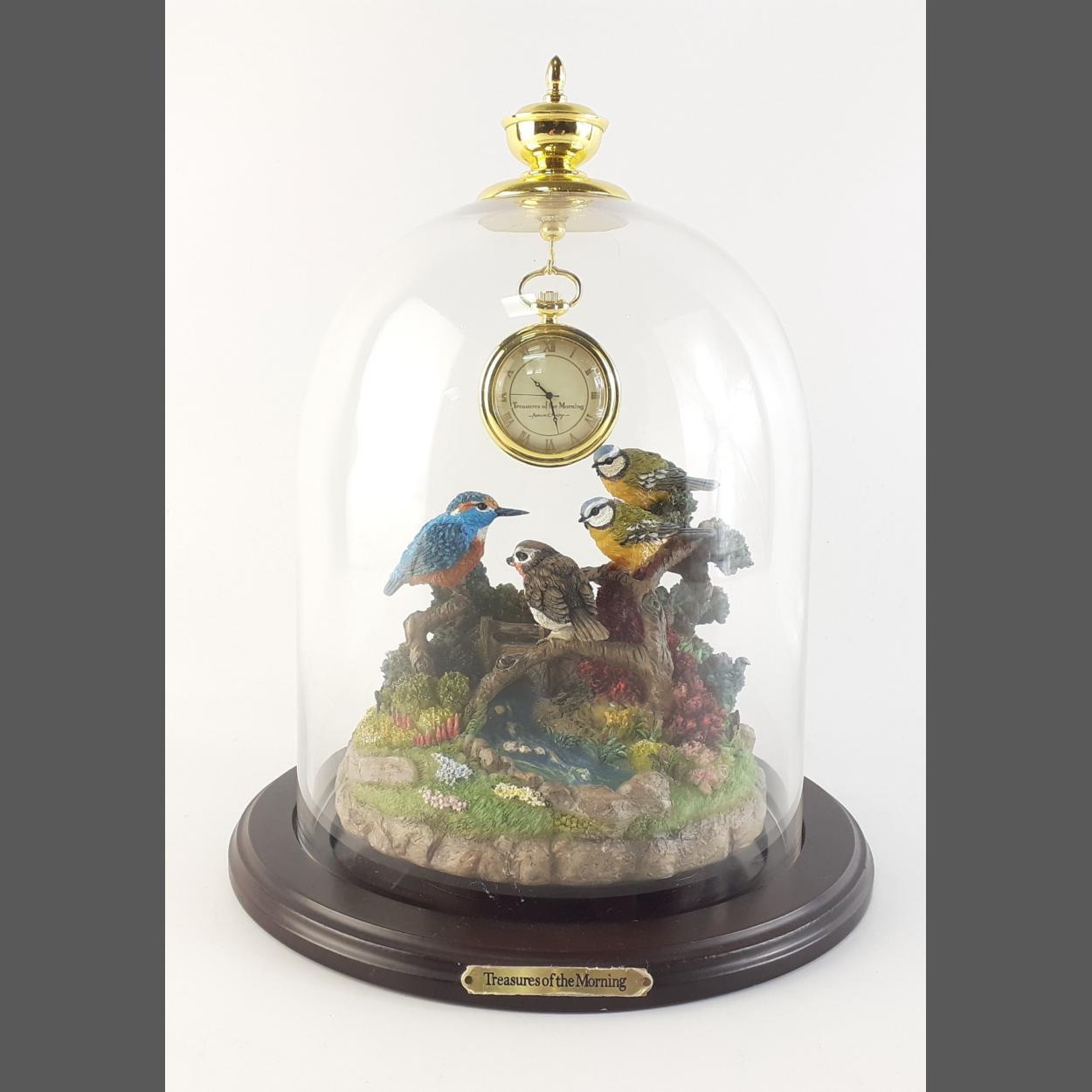 TREASURES OF THE MORNING a cute diorama of small birds in a bell jar with hanging pocket watch.