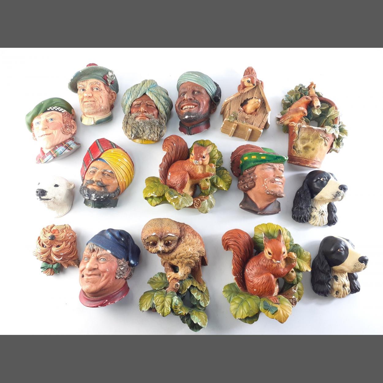 Top quality plaster wall plaques some by BOSSONS. Sixteen in total to include heads - Arabs, Scotsman, Robin Hood, animals etc. Most with minor chips.